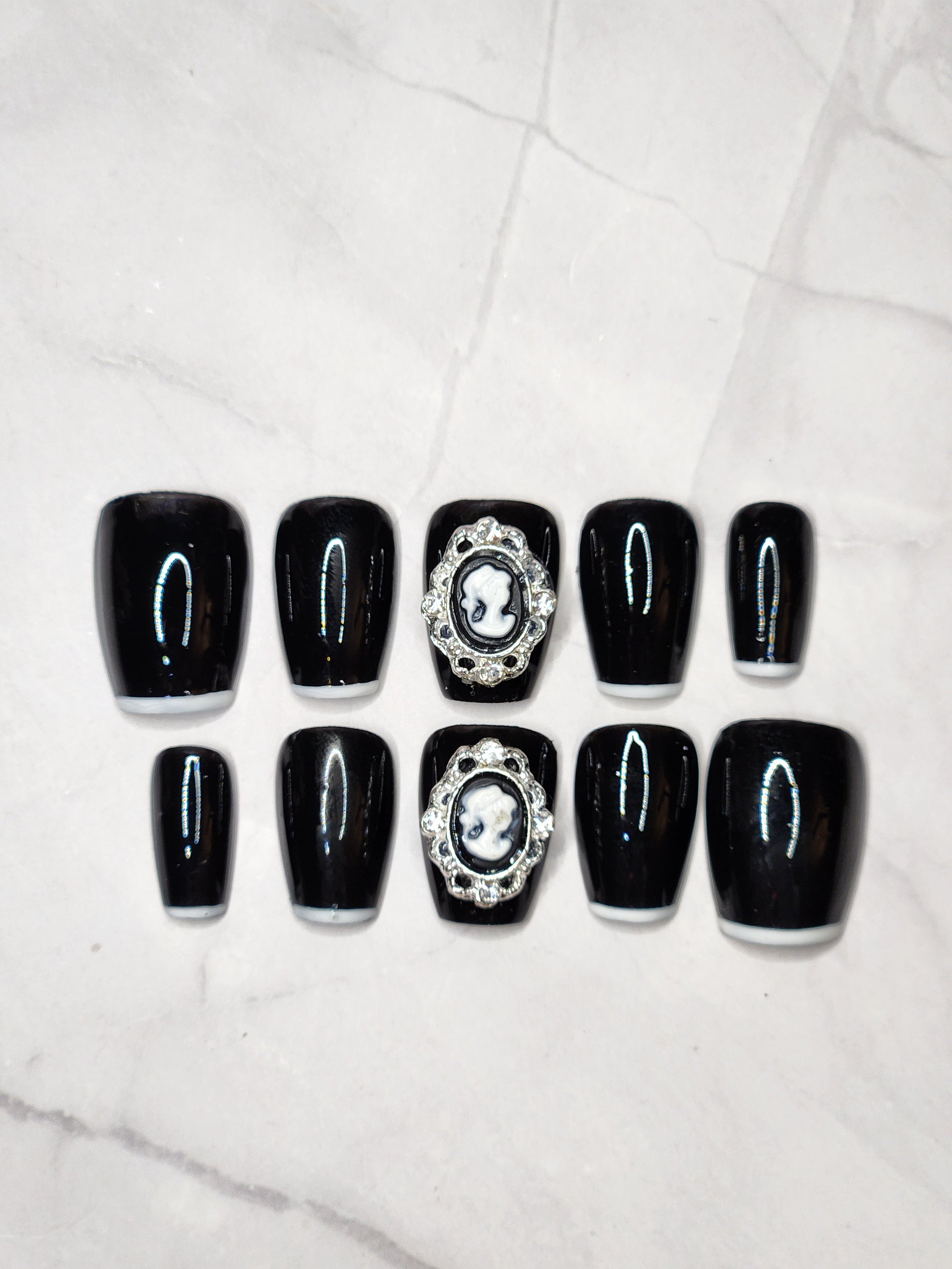 Black Duchess is a luxurious black press-on nail set featuring a glossy jet-black finish, delicate white tips, and regal cameo accents for a bold, vintage-inspired look. Elegant, reusable, and statement-making, this set is perfect for those who love timeless glam with a royal edge.