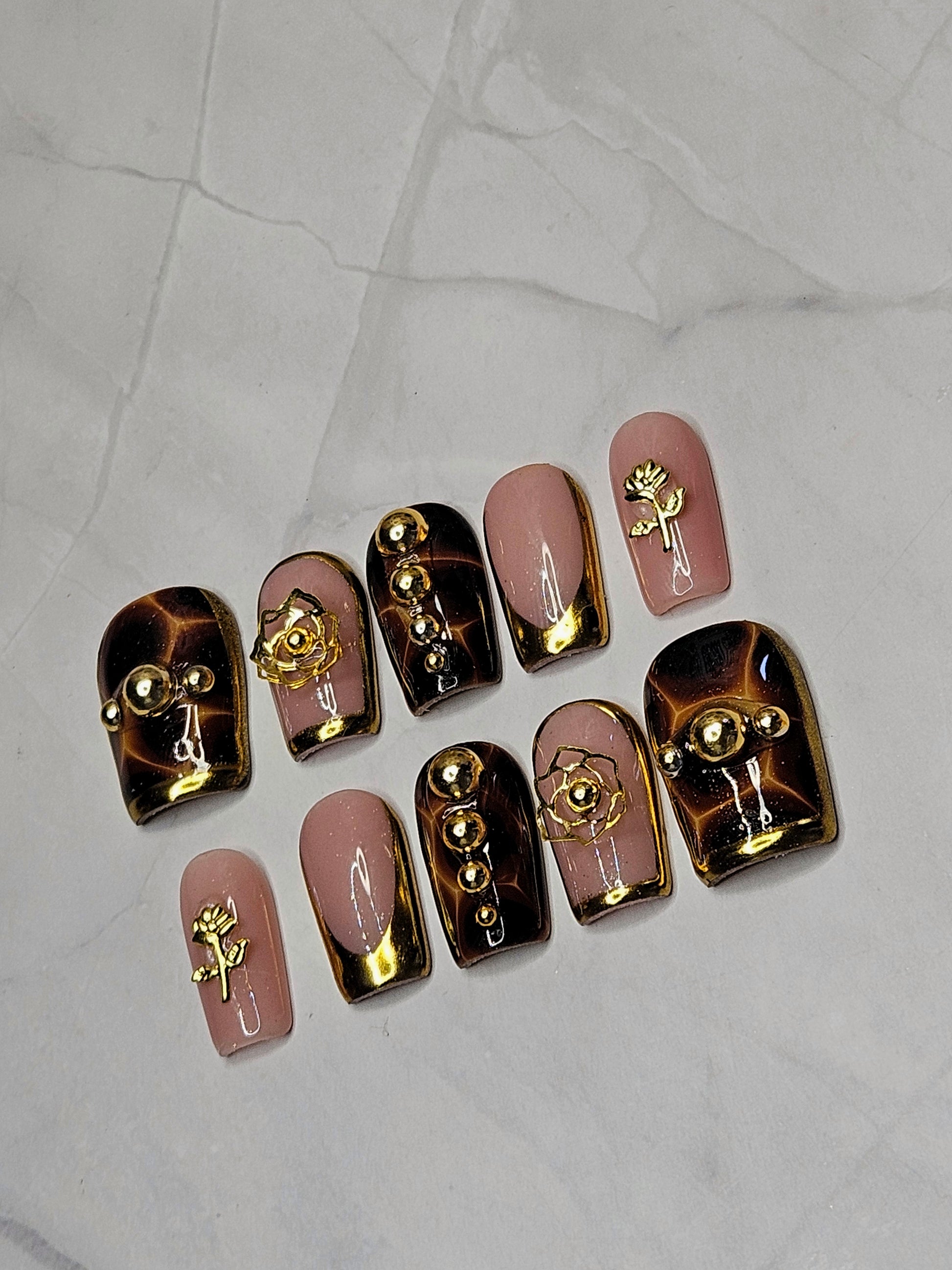 Pretty meets posh with these girly nude and gold nails! A mix of soft blush tones, tortoiseshell patterns, and shiny gold accents make this set totally irresistible. With dainty rose details and golden studs that catch the light just right, these nails give main character energy — classy, cute, and a little bit extra.