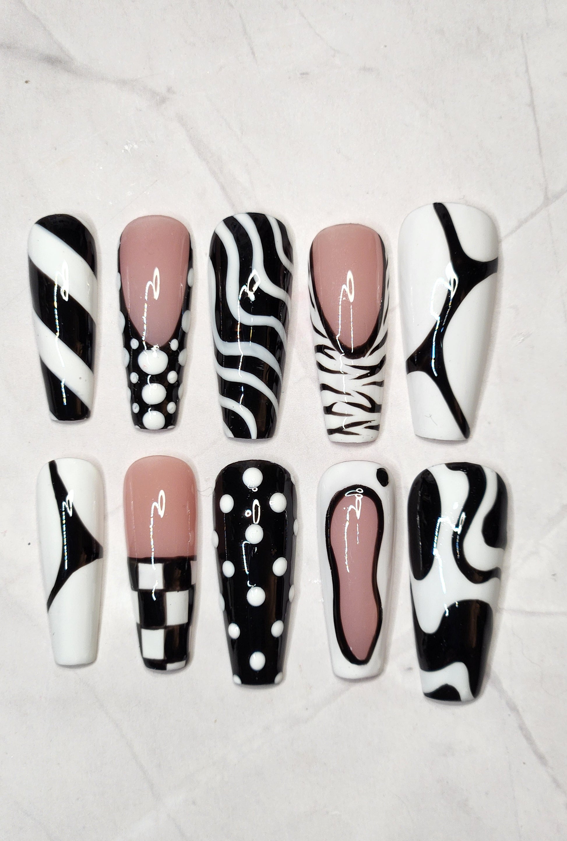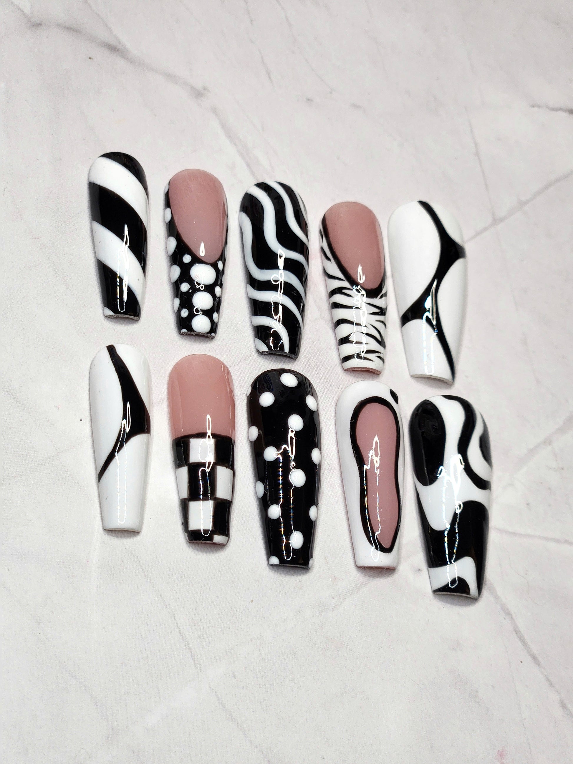Meet the ultimate statement set for the modern maximalist. This black, white, and soft nude press-on nail set features a luxe mix of abstract swirls, polka dots, and sleek monochrome patterns for a bold yet sophisticated look. Handcrafted with a high-gloss finish and salon-quality structure, each nail is designed to give effortless elegance with an edgy twist.