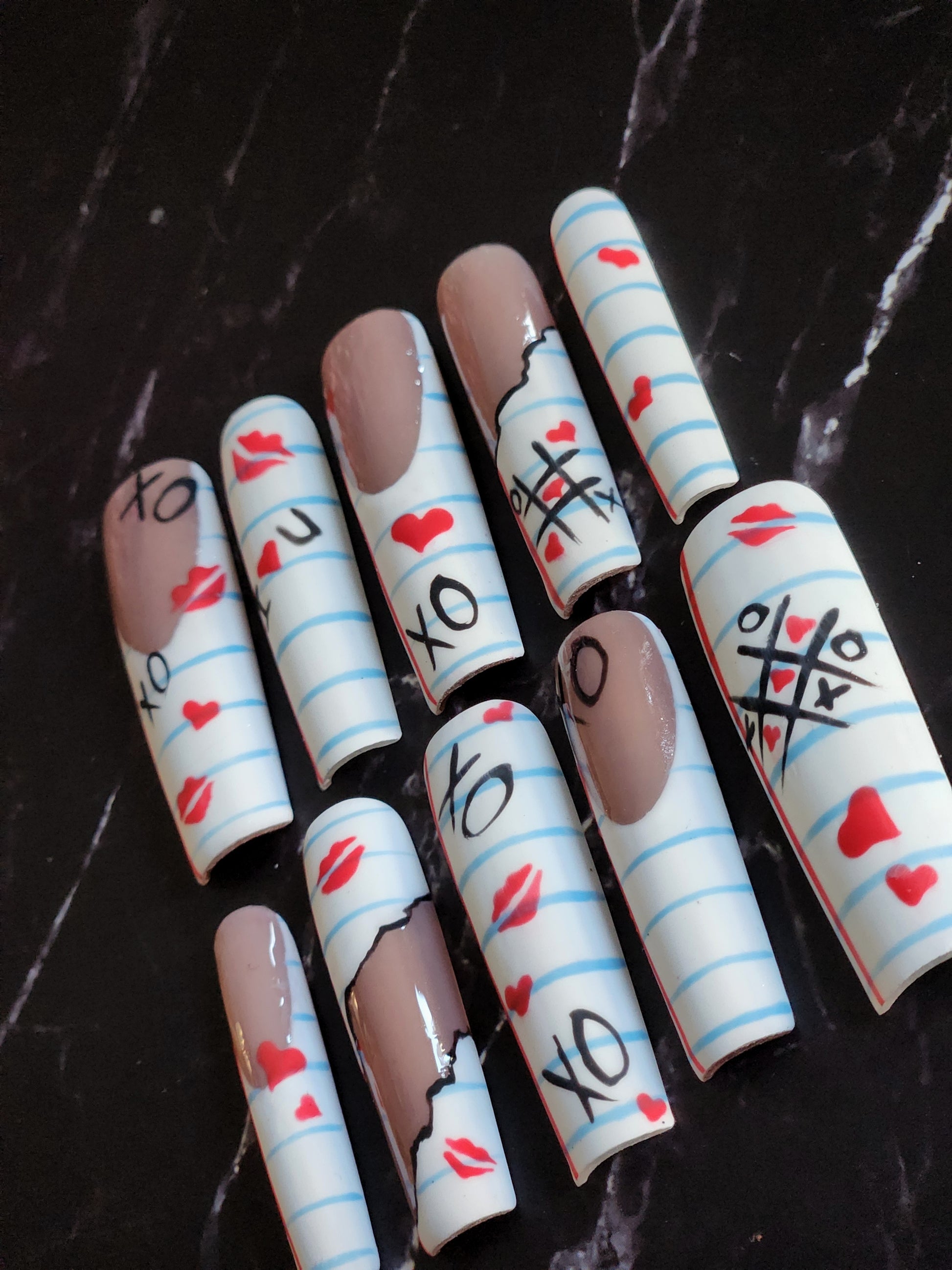 The perfect press-on set for anyone who lives for flirty vibes and handwritten romance. These hand-painted nails feature a fun notebook paper design with kiss stamps, doodles, hearts, and playful “XO” details — giving total love-letter energy.