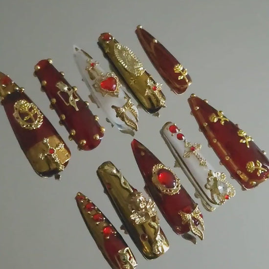 Step into divine luxury with these red and gold press-on nails—a heavenly fusion of elegance, passion, and power. Each nail is handcrafted with a rich red jelly base, crowned with ornate gold angel, cross, and rose charms that embody sacred beauty and timeless glamour