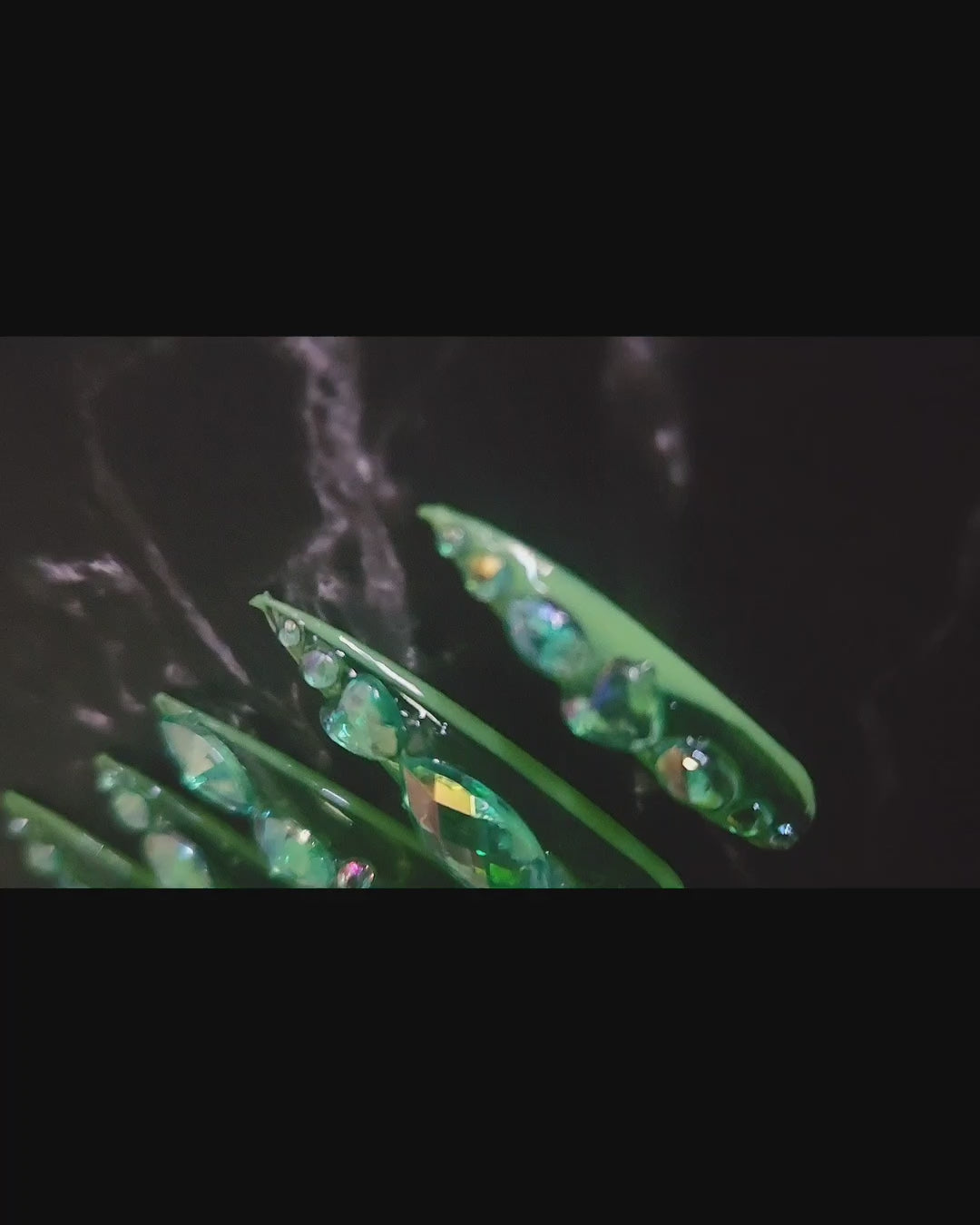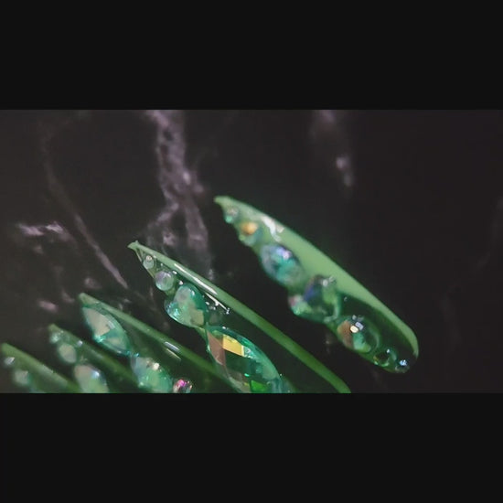 Meet the nails that don’t just shine—they flex. These press-ons are built on a see-through jelly green base, lined with a color-shifting green polish, and finished with glittering green rhinestones. The result? A look that’s dripping in luxury and unapologetically bold.