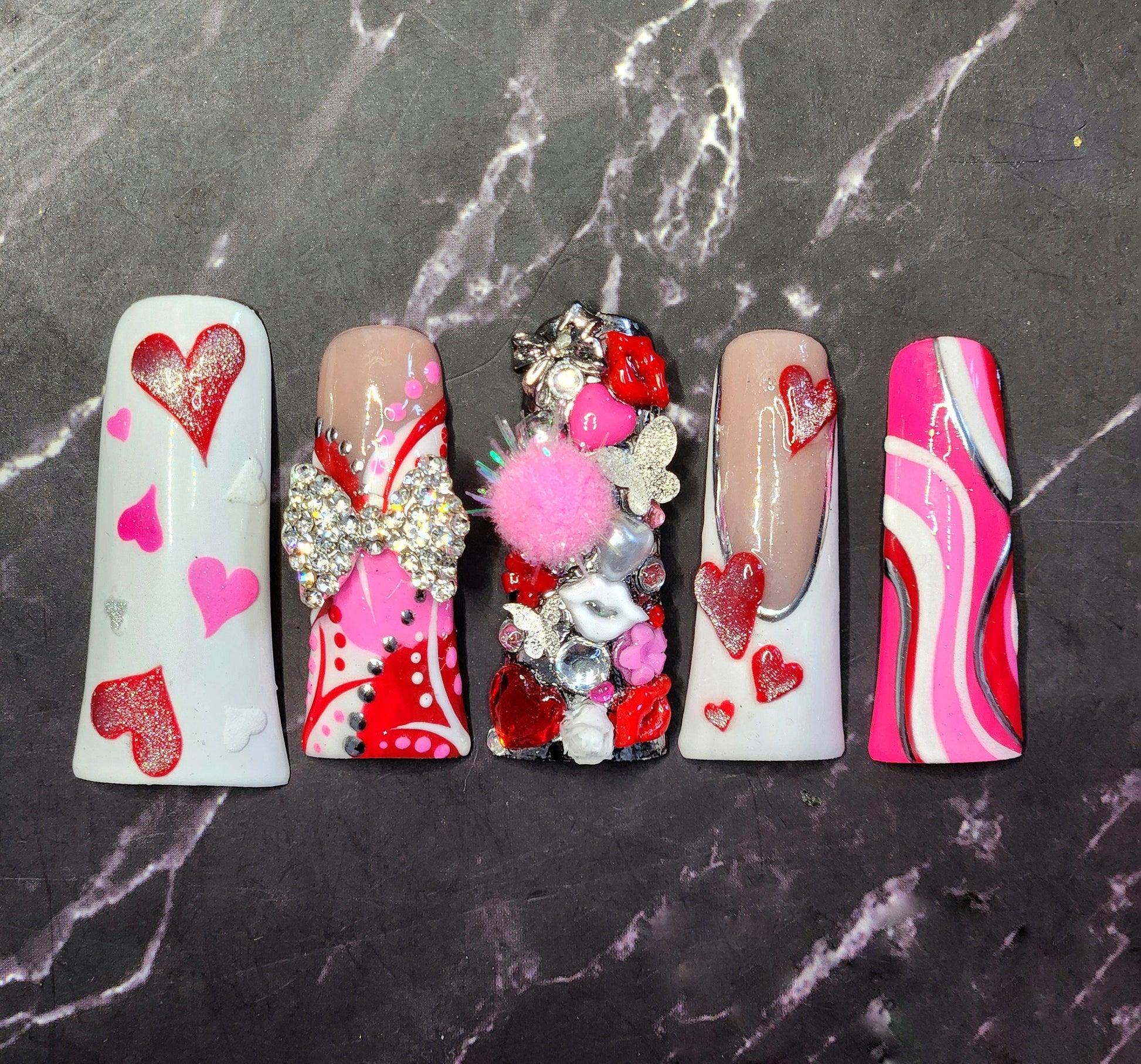 Turn heads and steal hearts with this ultra-glam, Valentine-inspired press-on nail set. Designed for lovers of bold beauty and maximalist detail, this statement set features hand-painted hearts, pink and red swirl accents, crystal clusters, metallic charms, glossy lips, fluffy texture elements, and sculpted embellishments for a truly couture finish.