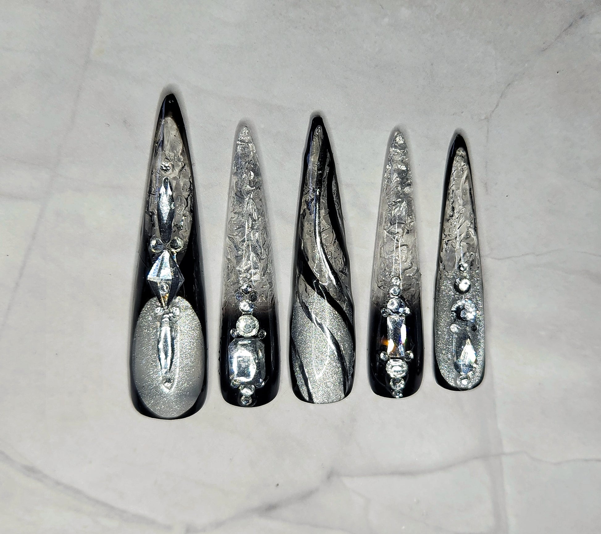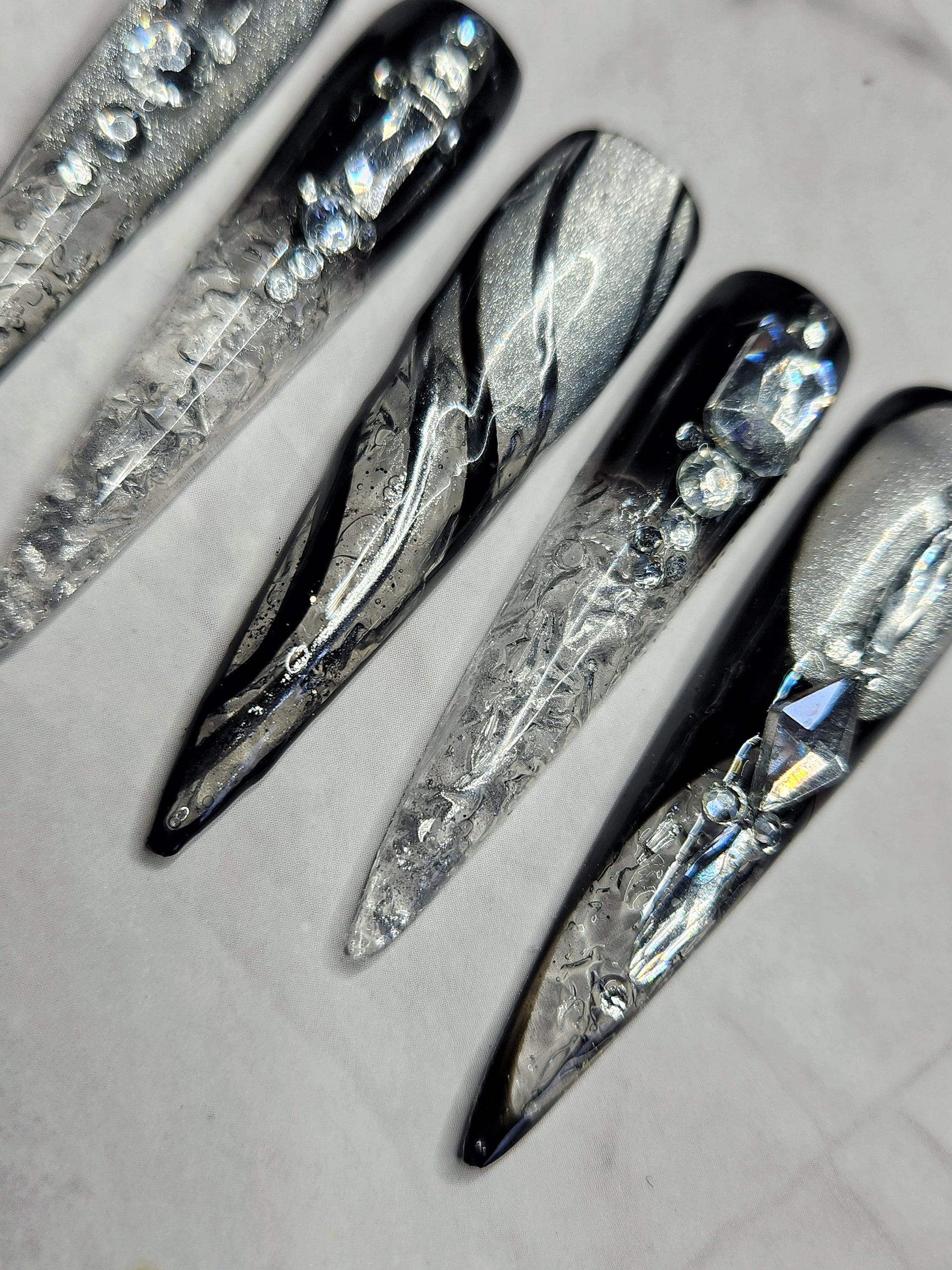 Turn heads with Frostbite Kiss, a bold black and silver cat-eye nail set designed to serve icy glam with a sassy edge. This luxe set features a deep black base layered with magnetic silver cat-eye shimmer that catches the light from every angle. Finished with sparkling silver rhinestones and frosted accents, these nails give full black ice energy—cold, confident, and irresistibly cute.