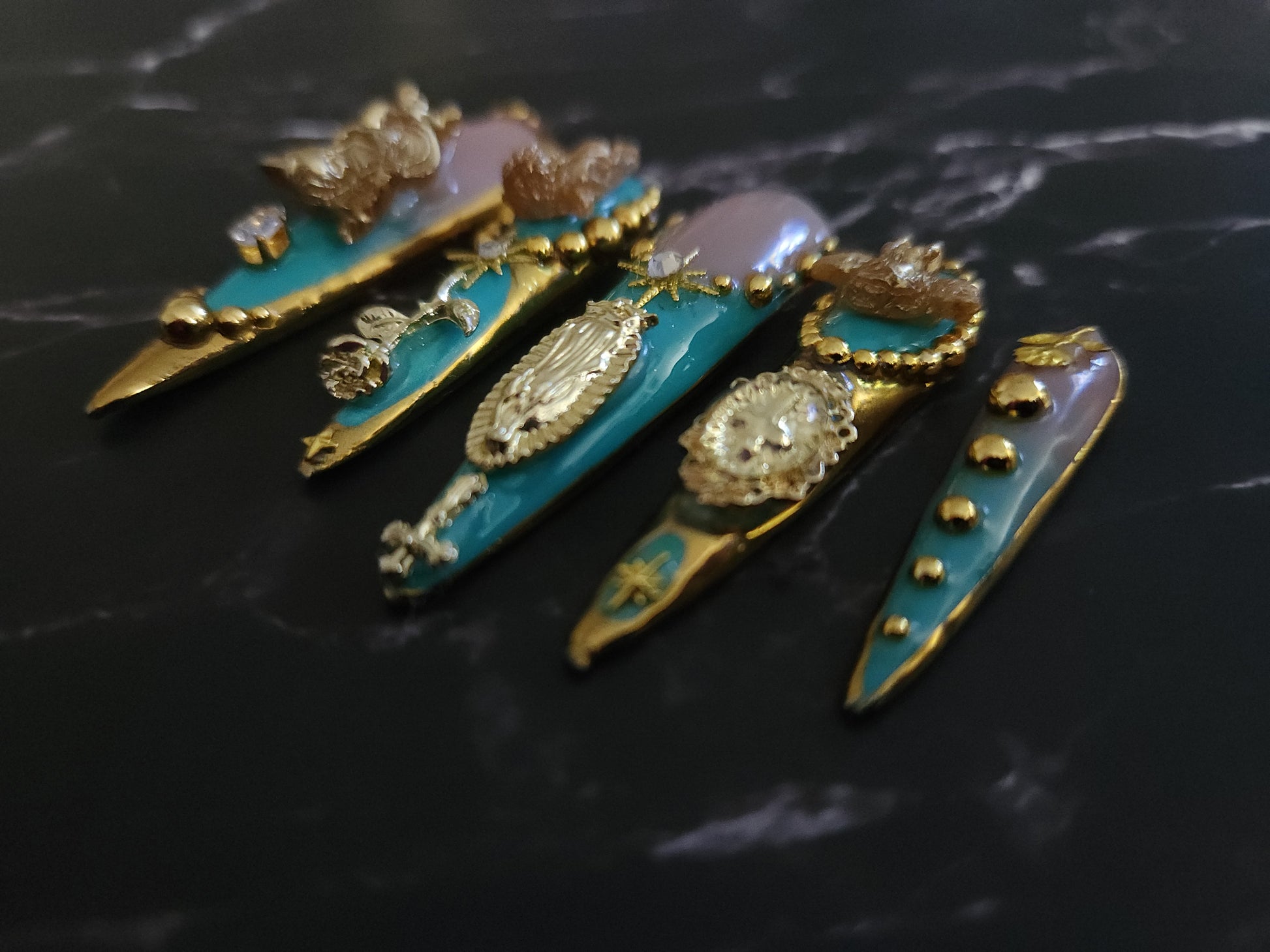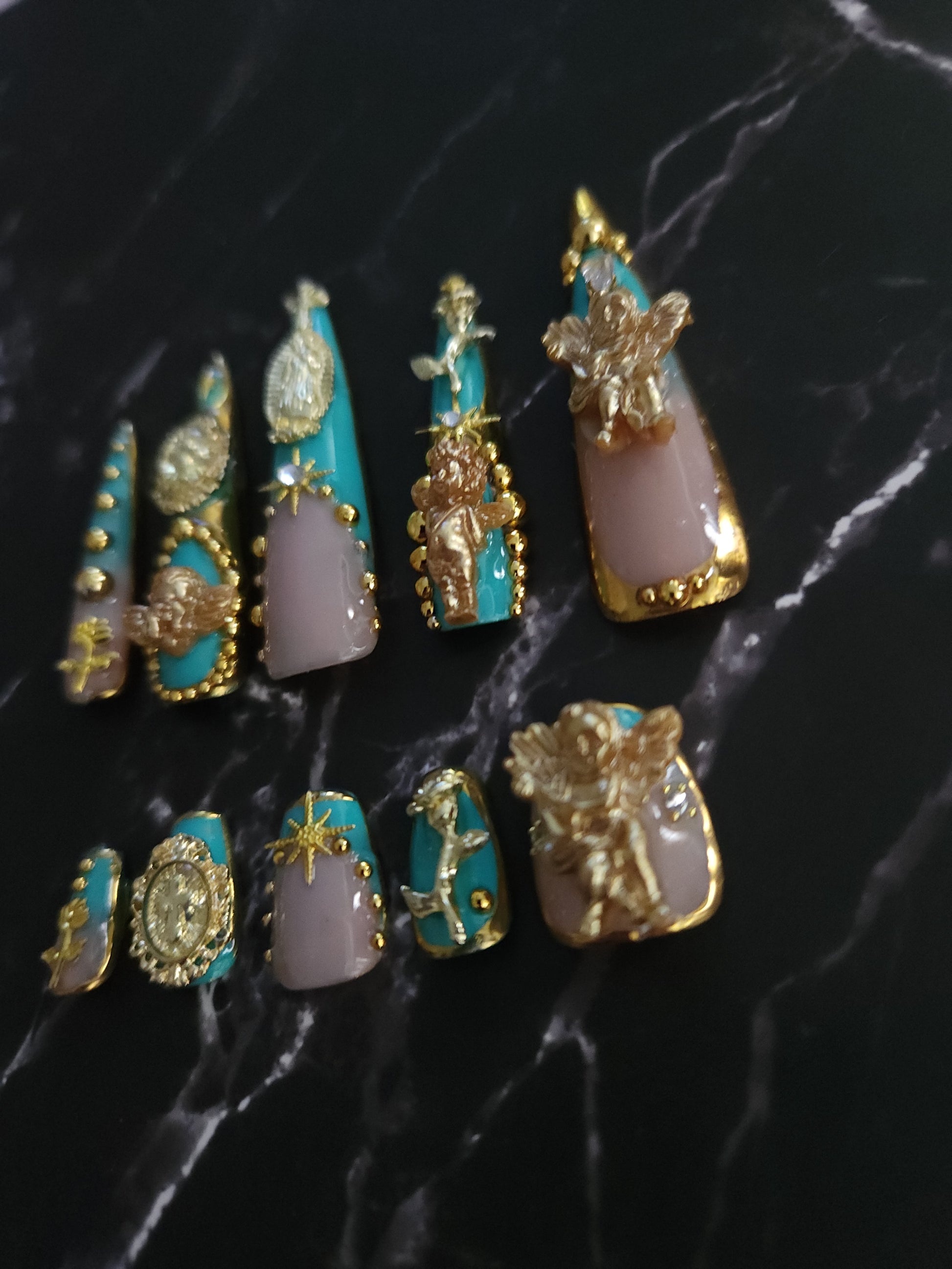 Introducing Holy Chic, the ultimate nail set for babes who love their glam with a side of divine drama. Drippin’ in gold, turquoise, and 3D angel vibes, these nails are giving “blessed but don’t test”