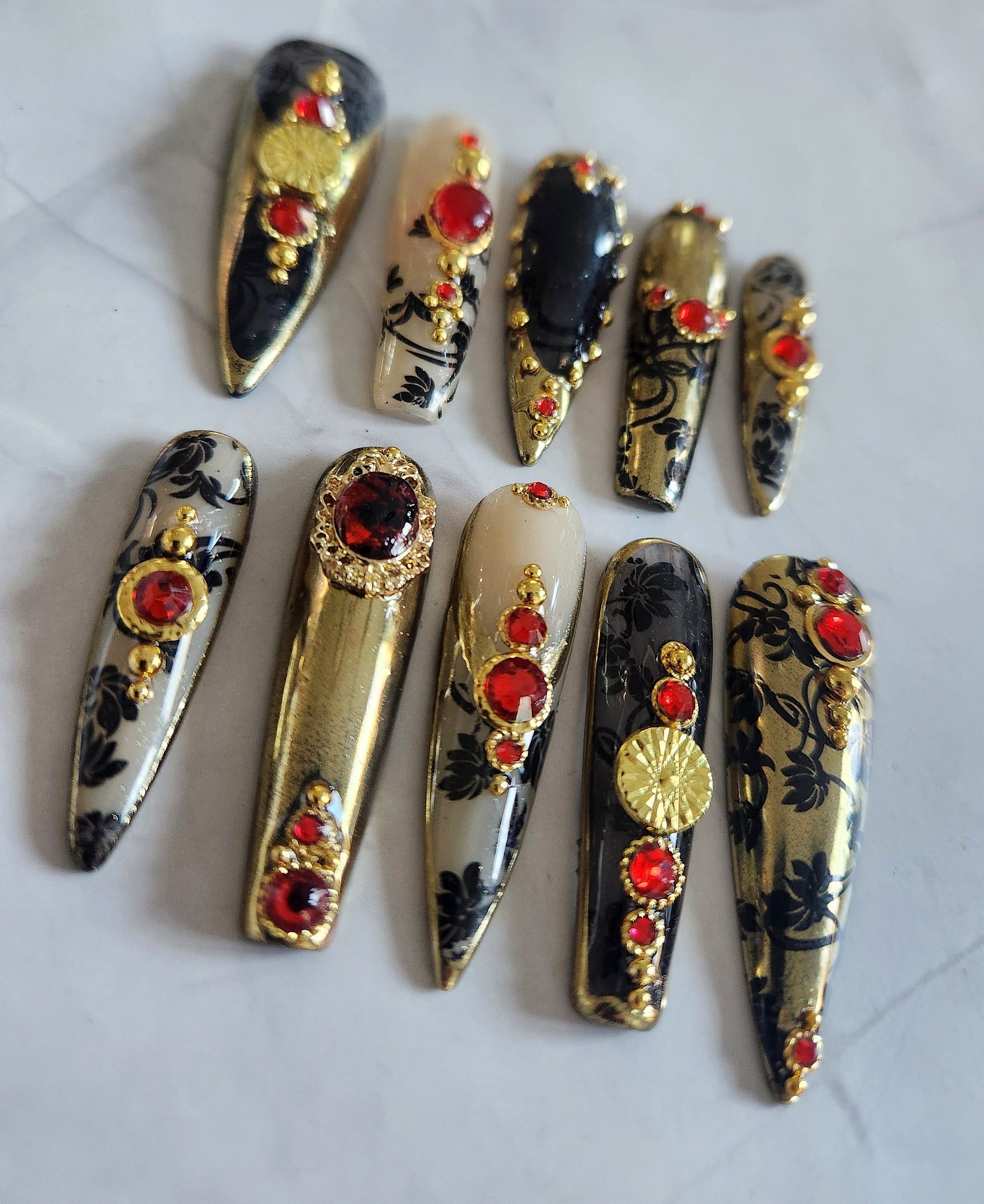 Timeless luxury with Imperial Rose, a statement press-on nail set designed for those who love opulence and detail. This handcrafted set features a rich blend of gold and soft nude bases, adorned with black floral detailing that creates a dramatic, vintage-inspired contrast. Each nail is elevated with deep red rhinestones and gold embellishments, evoking a regal, baroque aesthetic fit for royalty.