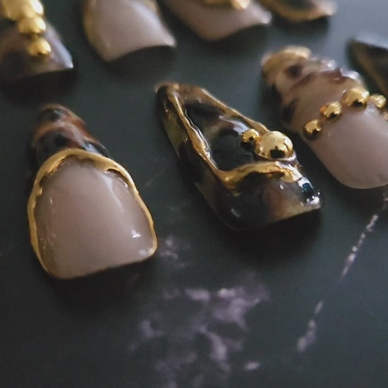 Elevate your manicure with our Shell Seduction luxury press-on nails — a stunning blend of classic tortoise shell design and modern gold chrome accents. Each handcrafted nail features rich brown and amber tones, framed with molten gold edges, 3D gold pearls, and intricate sculpted details for a high-fashion finish.