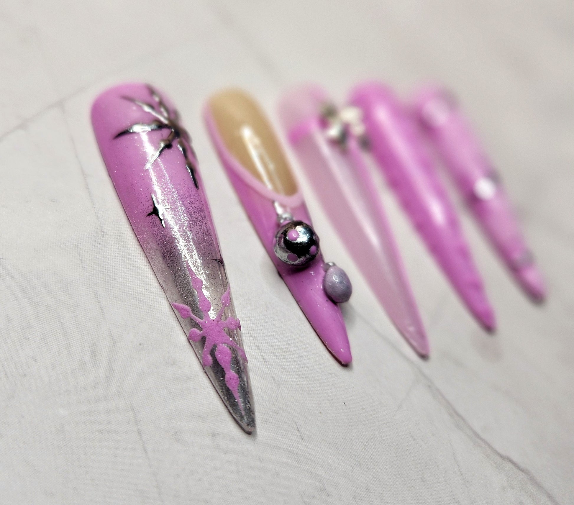 Full winter glam with our Snowflake Sweetheart press-on set — a luxe mix of soft pink tones, icy details, and ultra-feminine accents designed to make you stand out all season long. These long stiletto nails feature a blend of glossy and textured finishes, including a 3D knitted sweater design, handcrafted ornaments, chrome striping, and a frosty transparent tip that gives the perfect snow-kissed look