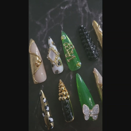 Unleash your inner goddess with our Virgo Luxe Press-On Nail Set, a bold and glamorous collection of 10 uniquely designed nails that blend elegance with fierce attitude. Perfect for statement-makers who love gold accents, rich emerald tones, and eye-catching embellishments.